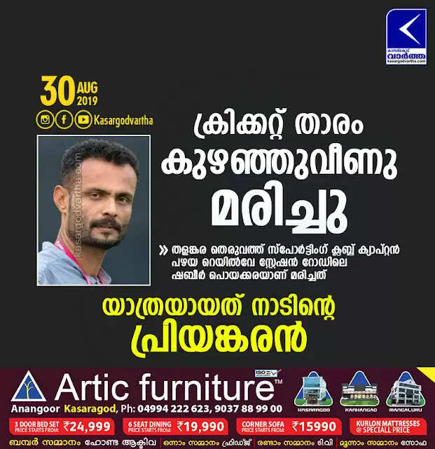 മികച്ച ക്രിക്കറ്റ് താരമായ ഷബീര് നേരത്തെ ഏതാനും വര്ഷം ഗള്ഫിലായിരുന്നു. നാട്ടുകാര്ക്ക് ഏറെ പ്രിയങ്കരനായ ഷബീറിന്റെ മരണം നാടിനെ ഒന്നടങ്കം ഞെട്ടിച്ചിരിക്കുകയാണ്. പരേതനായ പൊയക്കര ഉമ്പു- സൗദ ദമ്പതികളുടെ മകനാണ്. ഭാര്യ: ഷാഹിന. മക്കള്: നദ ഫാത്വിമ, നസീം, നസ്വാന്. സഹോദരങ്ങള്: നൂര്ജഹാന്, നിഷാദ്, ജബ്ന. ഖബറടക്കം വെള്ളിയാഴ്ച മഗ് രിബ് നിസ്കാരാനന്തരം മാലിക് ദീനാര് ജുമാമസ്ജിദ് ഖബര്സ്ഥാനില് നടക്കും.