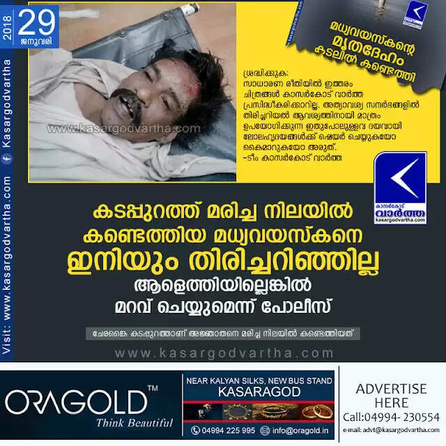 ശ്രദ്ധിക്കുക: സാധാരണ രീതിയില് ഇത്തരം ചിത്രങ്ങള് കാസര്കോട് വാര്ത്ത പ്രസിദ്ധീകരിക്കാറില്ല. അത്യാവശ്യ സന്ദര്ഭങ്ങളില് തിരിച്ചറിയല് ആവശ്യത്തിനായി മാത്രം ഉപയോഗിക്കുന്ന ഇതുപോലുള്ളവ ദയവായി ലോലഹൃദയങ്ങള്ക്ക് ഷെയര് ചെയ്യുകയോ കൈമാറുകയോ അരുത്.