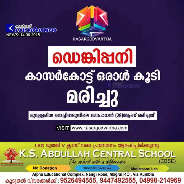 കാസര്‍കോട്: (www.kasargodvartha.com 14/06/2015) ഡെങ്കിപ്പനി ബാധിച്ച് ചികിത്സയിലായിരുന്ന കാസര്‍കോട് സ്വദേശി മരിച്ചു. മുള്ളേരിയ നെച്ചിപ്പടുപ്പിലെ മോഹനന്‍ (മോഗു-28)ആണ് മരിച്ചത്. പനിയെതുടര്‍ന്ന് കാസര്‍കോട്ടെ ആശുപത്രിയില്‍ പ്രവേശിപ്പിക്കുകയായിരുന്നു. തുടര്‍ന്ന് നടത്തിയ പരിശോധനയില്‍ ഡെങ്കിപ്പനിയാണെന്ന് വ്യക്തമായി.