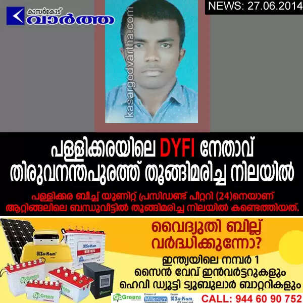Keywords : Pallikara, DYFI, Leader, Dead body, Obituary, Kasaragod, Thiruvananthapuram, Peter.