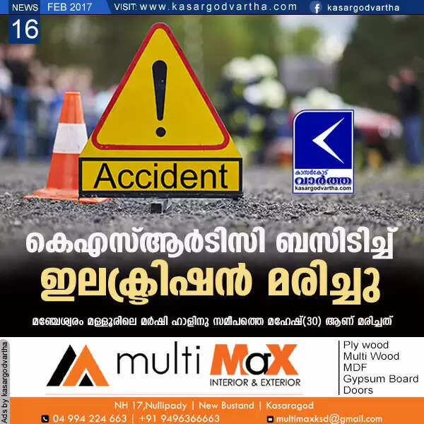 Keywords: Manjeshwaram, Kasaragod, KSRTC, Bus, Hospital, Obituary, Marshi Hall, Karnataka, Electrician, Electrician dies in accident.