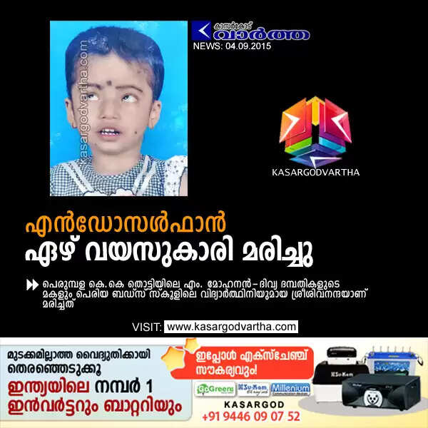 പെരുമ്പള: (www.kasargodvartha.com 04/09/2015) എന്‍ഡോസള്‍ഫാന്‍ മൂലം ദുരിതബാധിതയായ ഏഴ് വയസുകാരി മരിച്ചു. പെരുമ്പള കെ.കെ തൊട്ടിയിലെ എം. മോഹനന്‍ - ദിവ്യ ദമ്പതികളുടെ മകളും പെരിയ ബഡ്‌സ് സ്‌കൂളിലെ വിദ്യാര്‍ത്ഥിനിയുമായ ശ്രീശിവനന്ദയാണ് മരിച്ചത്.