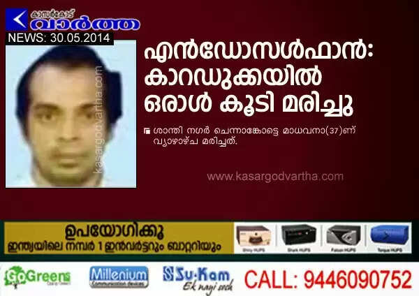 മുള്ളേരിയ:(www.kasargodvartha.com 30.05.2014) എന്ഡോസള്ഫാന് ദുരിത ബാധിതനായിരുന്ന കാറഡുക്കയിലെ ഒരാള്കൂടി മരിച്ചു. ശാന്തി നഗര് ചെന്നാങ്കോട്ടെ മാധവനാ(37)ണ് വ്യാഴാഴ്ച മരിച്ചത്. ദുരിത ബാധിതരുടെ പട്ടികയില് ഉള്പ്പെട്ടിരുന്നു.