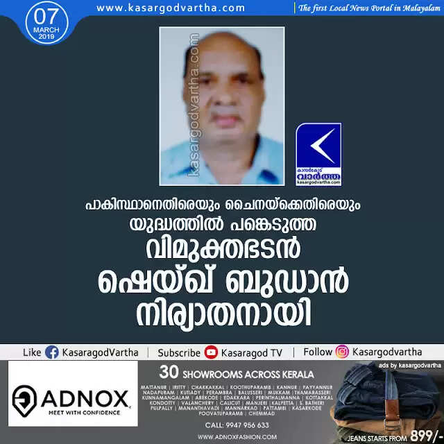 പാകിസ്ഥാനെതിരെയും ചൈനയ്‌ക്കെതിരെയും യുദ്ധത്തില്‍ പങ്കെടുത്ത വിമുക്തഭടന്‍ ഷെയ്ഖ് ബുഡാന്‍ നിര്യാതനായി