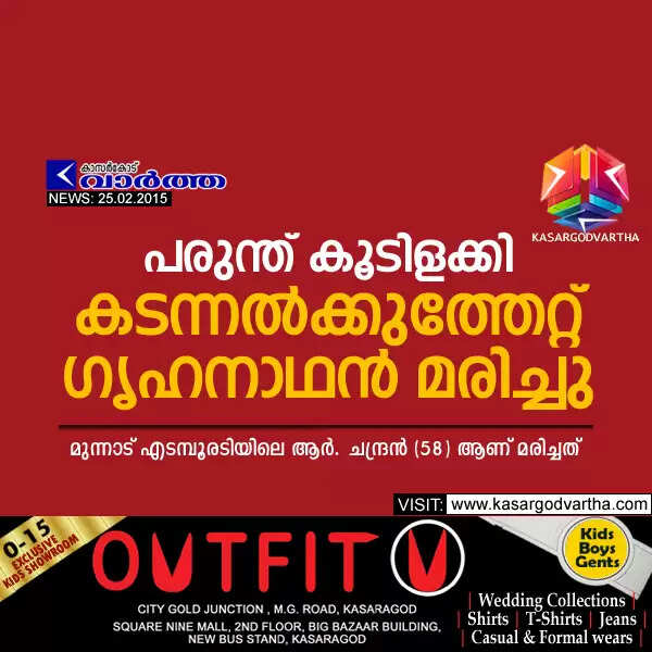 രക്ഷാ പ്രവര്ത്തനത്തിനിടെ കടന്നല്കുത്തേറ്റ് പരിക്കേറ്റ ജാനകിയെ മുന്നാട് ആശുപത്രിയില് പ്രവേശിപ്പിച്ചു. രാജ്കുമാര്, സി. ചന്ദ്രന് എന്നിവര്ക്കും പരിക്കേറ്റു. കടന്നല്ക്കൂട് നാട്ടുകാര് പിന്നീട് തീയിട്ട് നശിപ്പിച്ചു. ഭാര്യ: യശോദ. മക്കള്: ഹരീഷ്, അശ്വതി. മരുമകന്: ശ്രീജിത്ത്.