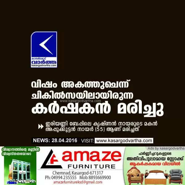 വിഷം അകത്തുചെന്ന് ചികില്സയിലായിരുന്ന കര്ഷകന് മരിച്ചു