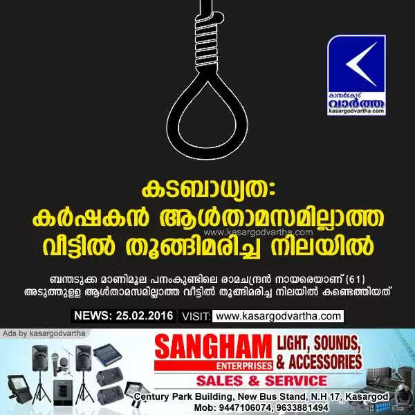 ബന്തടുക്ക: (www.kasargodvartha.com 25/02/2016) കടബാധ്യതയെ തുടര്‍ന്ന് മനോവിഷമത്തില്‍ കഴിയുകയായിരുന്ന കര്‍ഷകനെ ആള്‍താമസമില്ലാത്ത വീട്ടിനകത്ത് തൂങ്ങിമരിച്ച നിലയില്‍ കണ്ടെത്തി. ബന്തടുക്ക മാണിമൂല പനംകുണ്ടിലെ രാമചന്ദ്രന്‍ നായരെയാണ് (61) അടുത്തുള്ള ആള്‍താമസമില്ലാത്ത വീട്ടില്‍ തൂങ്ങിമരിച്ച നിലയില്‍ കണ്ടെത്തിയത്.