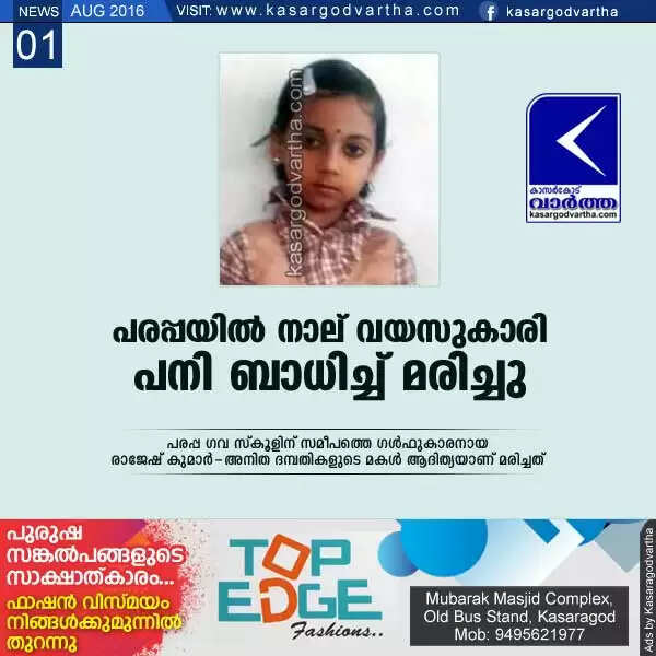 വെള്ളരിക്കുണ്ട്: (www.kasargodvartha.com 01/08/2016) നാല് വയസുകാരി പനി ബാധിച്ച് മരിച്ചു. വെള്ളരിക്കുണ്ട് പരപ്പ ഗവ സ്‌കൂളിന് സമീപത്തെ ഗള്‍ഫുകാരനായ രാജേഷ് കുമാര്‍ - അനിത ദമ്പതികളുടെ മകള്‍ ആദിത്യയാണ് മരിച്ചത്. തിങ്കളാഴ്ച പുലര്‍ച്ചെ പനി ബാധിച്ച് ഗുരുതരാവസ്ഥയിലായ ആദിത്യയെ കാഞ്ഞങ്ങാട് ജില്ലാ ആശുപത്രിയിലെത്തിച്ചെങ്കിലും ജീവന്‍ രക്ഷിക്കാനായില്ല.