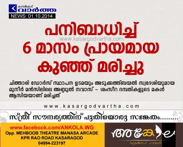കാസര്‍കോട്: (www.kasargodvartha.com 01.10.2014) പനിബാധിച്ച് ആശുപത്രിയില്‍ പ്രവേശിപ്പിക്കപ്പെട്ട ആറ് മാസം പ്രായമായ കുഞ്ഞ് മരിച്ചു. ചിത്താരി ഡോര്‍സ് സ്ഥാപന ഉടമയും അടുക്കത്ത്ബയല്‍ സ്വദേശിയുമായ മുനീര്‍ മന്‍സിലിലെ അബ്ദുല്‍ നവാസ് - ശംസീറ ദമ്പതികളുടെ മകള്‍ ആസിയയാണ് മരിച്ചത്.