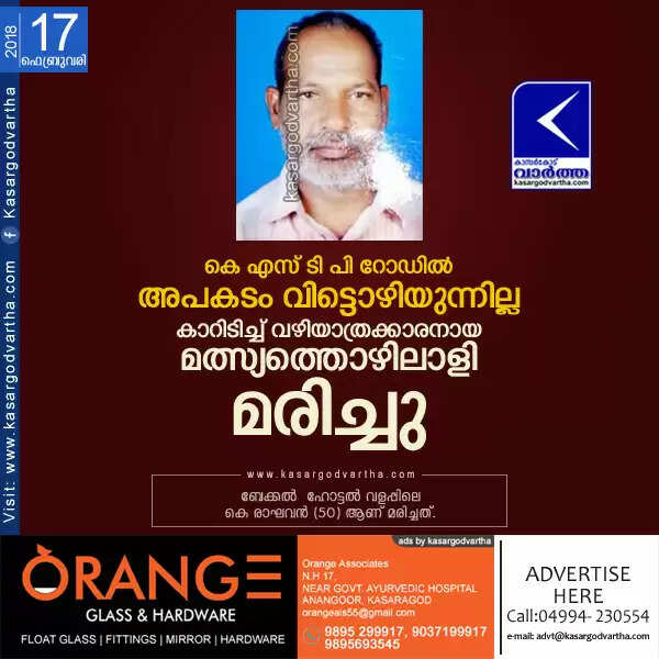കെ എസ് ടി പി റോഡില് അപകടം വിട്ടൊഴിയുന്നില്ല; കാറിടിച്ച് വഴിയാത്രക്കാരനായ മത്സ്യത്തൊഴിലാളി മരിച്ചു