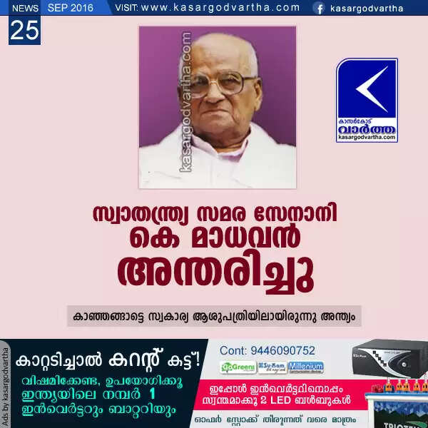 Keywords : Obituary, Kanhangad, Kasaragod, Leader, K Madhavan, Freedom Fighter.