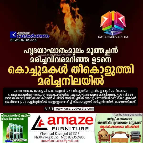 തൃക്കരിപ്പൂര്‍: (www.kasargodvartha.com 07/12/2015) ഹൃദയാഘാതംമൂലം മുത്തച്ഛന്‍ മരിച്ചവിവരമറിഞ്ഞ ഉടനെ കൊച്ചുമകളെ തീകൊളുത്തി മരിച്ചനിലയില്‍ കണ്ടെത്തി. പടന്ന തെക്കേക്കാട്ടെ പി കെ കണ്ണന്‍ (75) തിങ്കളാഴ്ച പുലര്‍ച്ചെ ആറ് മണിയോടെ ചെറുവത്തൂരിലെ സ്വകാര്യ ആശുപത്രിയില്‍ ഹൃദയാഘാതംമൂലം മരിച്ചിരുന്നു. ഈ വിവരം തെക്കേക്കാട്ടെ വീട്ടിലേക്ക് ഫോണ്‍ ചെയ്ത് അറിയിച്ചതിന് തൊട്ടുപിന്നാലെയാണ് കൊച്ചുമകള്‍ രേഷ്മയെ (22) ബെഡ്‌റൂമില്‍ മണ്ണെണ്ണയൊഴിച്ച് തീകൊളുത്തി മരിച്ചനിലയില്‍ കണ്ടെത്തിയത്.