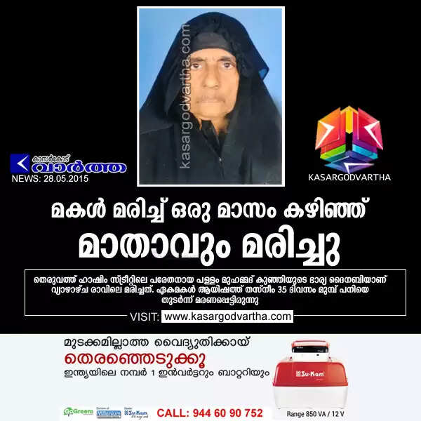 തളങ്കര: (www.kasargodvartha.com 28/05/2015) മകള് മരിച്ച് ഒരു മാസം കഴിഞ്ഞ് മാതാവും മരിച്ചു. തെരുവത്ത് ഹാഷിം സ്ട്രീറ്റിലെ പരേതനായ പള്ളം മുഹമ്മദ് കുഞ്ഞിയുടെ ഭാര്യ ദൈനബി (55)യാണ് വ്യാഴാഴ്ച രാവിലെ മരിച്ചത്. ഏകമകള് ആയിഷത്ത് തസ്നീം 35 ദിവസം മുമ്പ് പനിയെ തുടര്ന്ന് മരണപ്പെട്ടിരുന്നു.