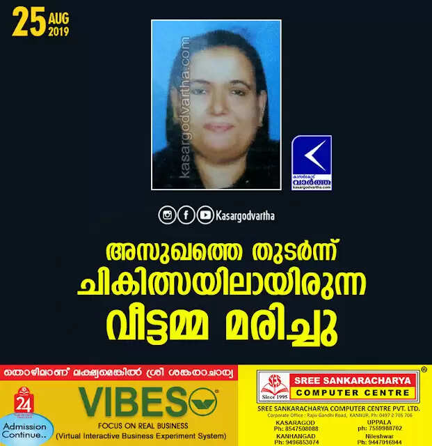 Keywords:  Kasaragod, Kerala, news, House-wife, Death, Obituary, Treatment, House wife died after illness