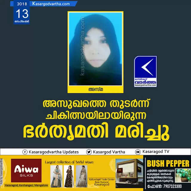 ബോവിക്കാനം: (www.kasargodvartha.com 13.09.2018) അസുഖത്തെ തുടര്‍ന്ന് ചികിത്സയിലായിരുന്ന ഭര്‍തൃമതി മരണപ്പെട്ടു. ബോവിക്കാനം എട്ടാംമൈലിലെ അബ്ദുര്‍ റഹ് മാന്‍ കൊടവഞ്ചിയുടെ ഭാര്യ അസ്മ (38)യാണ് മരിച്ചത്. കരള്‍ സംബന്ധമായ അസുഖത്തെ തുടര്‍ന്ന് ചികിത്സയിലായിരുന്നു. കാസര്‍കോട്ടെ സ്വകാര്യ ആശുപത്രിയില്‍ വെച്ച് ബുധനാഴ്ച രാവിലെയോടെയാണ് മരണം സംഭവിച്ചത്.