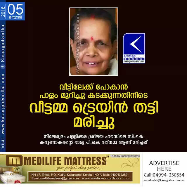 Keywords: Kasaragod, Kerala, Neeleswaram, Death, Train, House, Obituary, House wife dies after train hits.