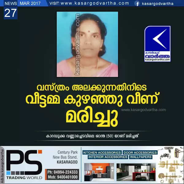 മുള്ളേരിയ: (www.kasargodvartha.com 27.03.2017) വസ്ത്രം അലക്കുന്നതിനിടെ വീട്ടമ്മ കുഴഞ്ഞ് വീണ് മരിച്ചു. കാറഡുക്ക വണ്ണാച്ചെടവിലെ ശാന്ത (50) യാണ് മരിച്ചത്. കാസര്‍കോട് വാഹന ഷോറൂമിലെ ജീവനക്കാരിയാണ്.