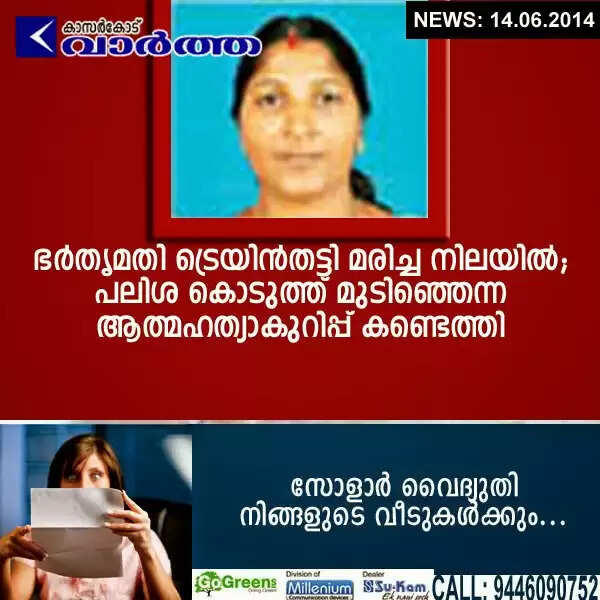ഭര്‍തൃമതി ട്രെയിന്‍തട്ടിമരിച്ചനിലയില്‍; പലിശ കൊടുത്ത് മുടിഞ്ഞെന്ന ആത്മഹത്യാകുറിപ്പ് കണ്ടെത്തി