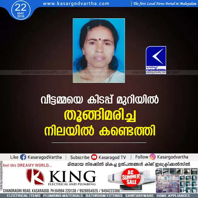 Keywords:  Kasaragod, Kerala, news, House-wife, Death, Hanged, Obituary, House wife found dead hanged