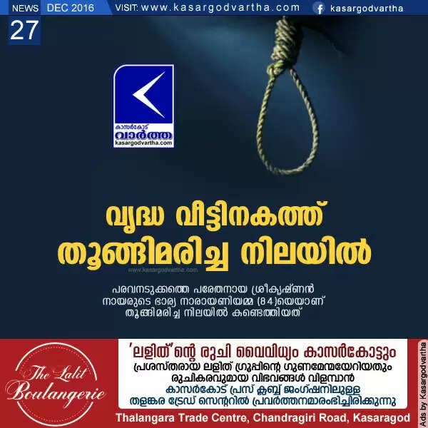 ചെമ്മനാട്: (www.kasargodvartha.com 27/12/2016) വൃദ്ധയെ വീട്ടിനകത്ത് തൂങ്ങിമരിച്ച നിലയില് കണ്ടെത്തി. പരവനടുക്കത്തെ പരേതനായ ശ്രീകൃഷ്ണന് നായരുടെ ഭാര്യ നാരായണിയമ്മ (84)യെയാണ് തൂങ്ങിമരിച്ച നിലയില് കണ്ടെത്തിയത്. വീട്ടില് ആരുമുണ്ടായിരുന്നില്ല. ബന്ധുവായ ഒരാള് എത്തി നോക്കിയപ്പോഴാണ് നാരായണിയമ്മയെ തൂങ്ങിമരിച്ച നിലയില് കണ്ടെത്തിയത്.