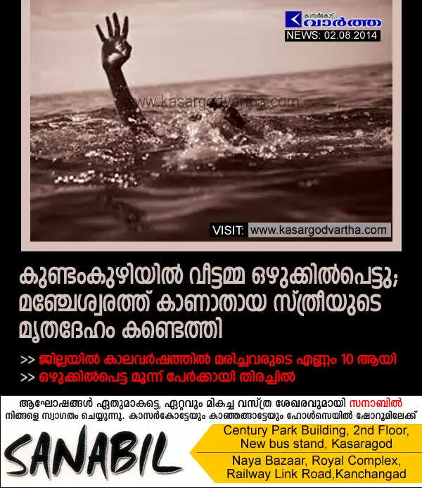 കുണ്ടംകുഴിയില് വീട്ടമ്മ ഒഴുക്കില്പെട്ടു; മഞ്ചേശ്വരത്ത് കാണാതായ സ്ത്രീയുടെ മൃതദേഹം കണ്ടെത്തി
