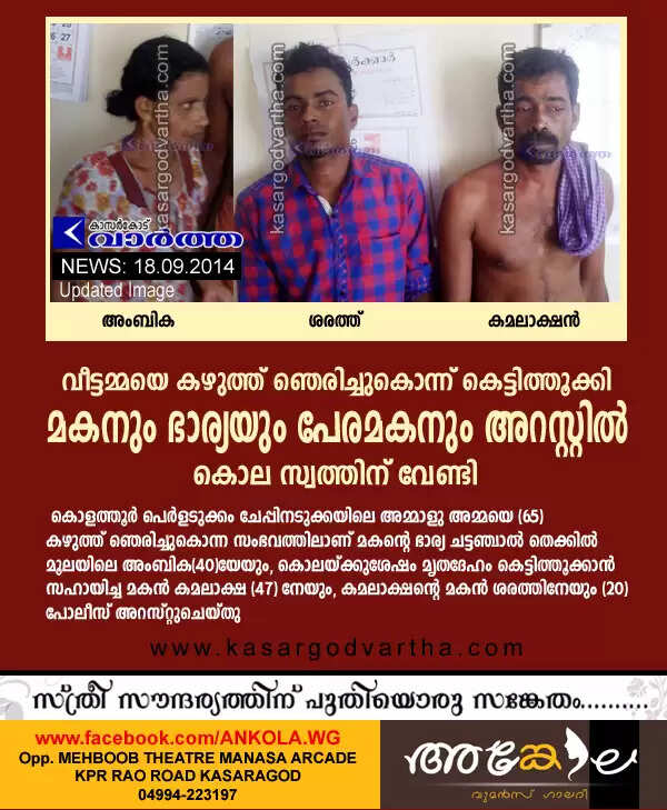 വീട്ടമ്മയെ കഴുത്ത് ഞെരിച്ചുകൊന്ന് കെട്ടിത്തൂക്കി; മകനും ഭാര്യയും പേരമകനും അറസ്റ്റില്