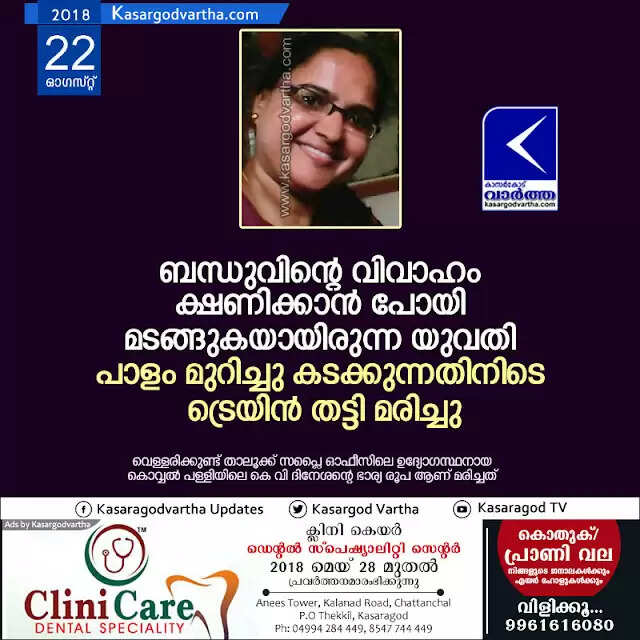 കാഞ്ഞങ്ങാട്: (www.kasargodvartha.com 22/08/2018) ബന്ധുവിന്റെ വിവാഹം ക്ഷണിക്കാന്‍ പോയി മടങ്ങുകയായിരുന്ന വീട്ടമ്മ പാളം മുറിച്ചു കടക്കുന്നതിനിടെ ട്രെയിന്‍ തട്ടി മരിച്ചു. വെള്ളരിക്കുണ്ട് താലൂക്ക് സപ്ലൈ ഓഫീസിലെ ഉദ്യോഗസ്ഥനായ കൊവ്വല്‍ പള്ളിയിലെ കെ വി ദിനേശന്റെ ഭാര്യ രൂപ (41) ആണ് മരിച്ചത്. ബുധനാഴ്ച വൈകുന്നേരം നാലര മണിയോടെ കാഞ്ഞങ്ങാട്ട് വെച്ചാണ് സംഭവം.