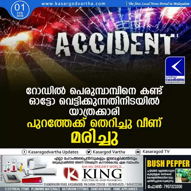 റോഡില് പെരുമ്പാമ്പിനെ കണ്ട് ഓട്ടോ വെട്ടിക്കുന്നതിനിടയില് യാത്രക്കാരി പുറത്തേക്ക് തെറിച്ചു വീണ് മരിച്ചു