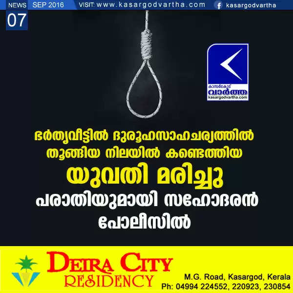 ഭര്‍തൃവീട്ടില്‍ ദുരൂഹസാഹചര്യത്തില്‍ തൂങ്ങിയ നിലയില്‍ കണ്ടെത്തിയ യുവതി മരിച്ചു; പരാതിയുമായി സഹോദരന്‍ പോലീസില്‍