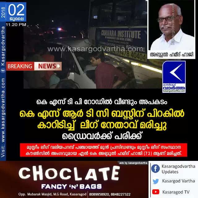 Keywords: Obituary, Accident, Accidental-Death, Top-Headlines, kasaragod, Car-Accident, Bus, KSRTC, KSRTC-bus, IUML leader dies in accident, N.K. Abdul Hameed Haji