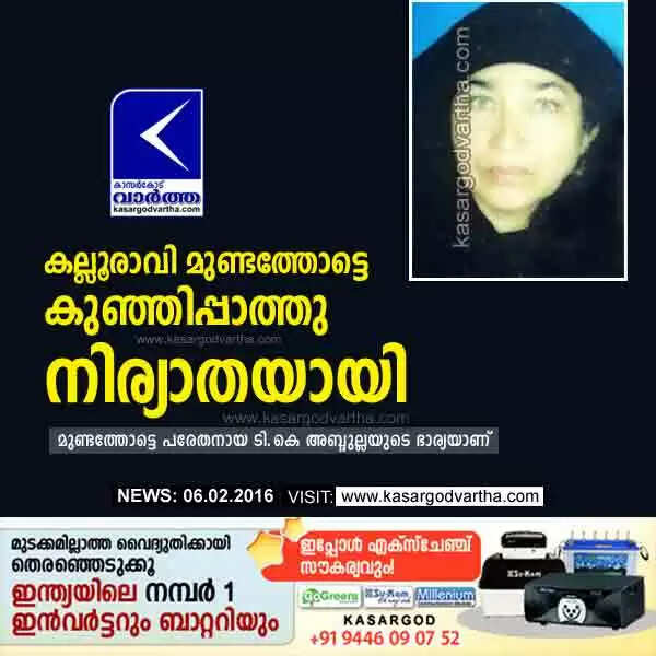 കാഞ്ഞങ്ങാട്: (www.kasargodvartha.com 06/02/2016) കല്ലൂരാവി മുണ്ടത്തോട്ടെ പരേതനായ ടി.കെ അബ്ദുല്ലയുടെ ഭാര്യ കുഞ്ഞിപ്പാത്തു (65) നിര്യാതയായി. പരേതനായ അഹ് മദ്-ഹലീമ ദമ്പതികളുടെ മകളാണ്. മക്കള്: മഹ് മൂദ്, അബൂബക്കര്, അബ്ദുര് റഹ് മാന് (ഗള്ഫ്). മരുമക്കള്: താഹിറ (ബല്ലാകടപ്പുറം), സബിദ (ഞാണിക്കടവ്), ഷഹാന (മുട്ടുന്തല).