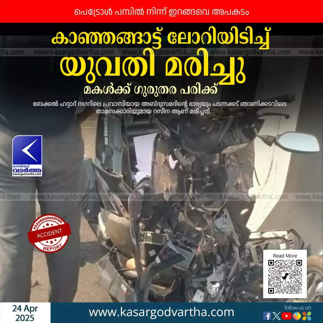 പെട്രോൾ പമ്പിൽ നിന്ന് ഇറങ്ങവെ അപകടം; കാഞ്ഞങ്ങാട്ട് ലോറിയിടിച്ച് യുവതി മരിച്ചു, മകൾക്ക് ഗുരുതര പരിക്ക്