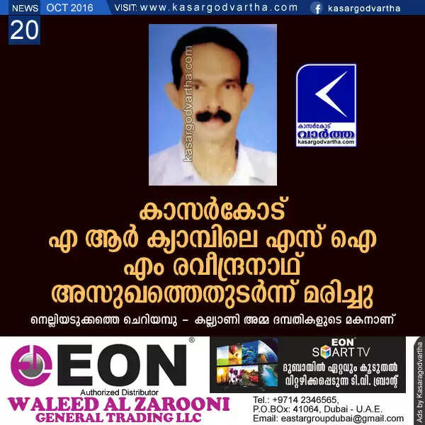 കാസര്‍കോട് എ ആര്‍ ക്യാമ്പിലെ എസ് ഐ എം രവീന്ദ്രനാഥ് അസുഖത്തെതുടര്‍ന്ന് മരിച്ചു