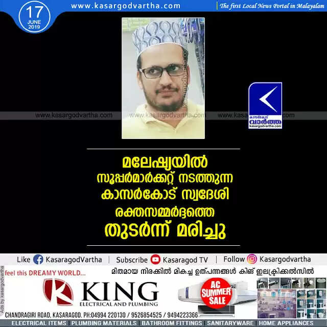 മലേഷ്യയില് സൂപ്പര്മാര്ക്കറ്റ് നടത്തുന്ന കാസര്കോട് സ്വദേശി രക്തസമ്മര്ദ്ദത്തെ തുടര്ന്ന് മരിച്ചു