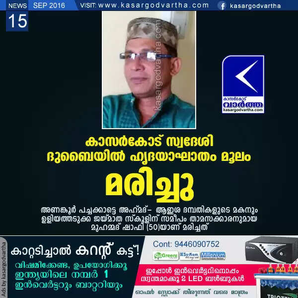 ദുബൈ: (www.kasargodvartha.com 15/09/2016) കാസര്കോട് സ്വദേശി ദുബൈയില് മരണപ്പെട്ടു. അണങ്കൂര് പച്ചക്കാട്ടെ അഹ് മദ്- പരേതയായ ആഇശ ദമ്പതികളുടെ മകന് മുഹമ്മദ് ഷാഫി (50)യാണ് മരിച്ചത്. ഹൃദയാഘാതംമൂലമാണ് മരണം സംഭവിച്ചത്. ഉളിയത്തടുക്ക ജയ്മാത സ്കൂളിന് സമീപമാണ് കുടുംബസമേതം ഇപ്പോള് താമസിക്കുന്നത്.