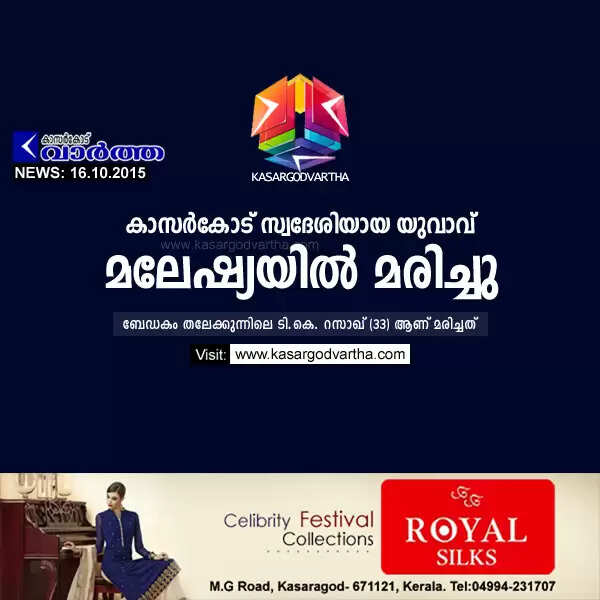 ബേഡകം: (www.kasargodvartha.com 16/10/2015) കാസര്‍കോട് സ്വദേശിയായ യുവാവ് മലേഷ്യയില്‍ മരിച്ചു. ബേഡകം തലേക്കുന്നിലെ ടി.കെ. റസാഖ് (33) ആണ് മരിച്ചത്. ടി കെ മുഹമ്മദ്- നബീസ ദമ്പതികളുടെ മകനാണ്.