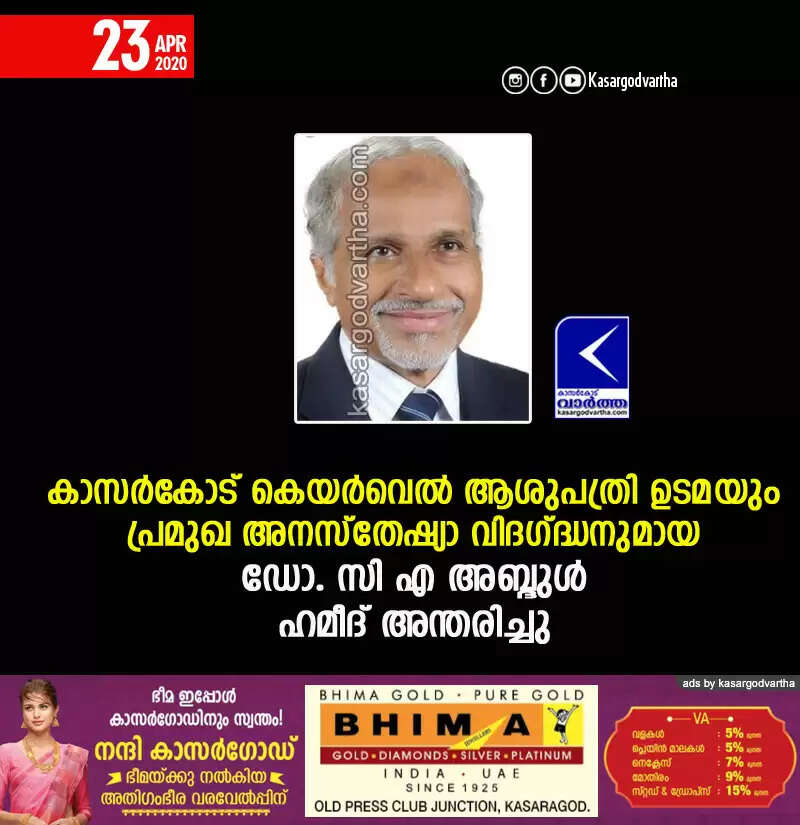 കാസര്‍കോട് കെയര്‍വെല്‍ ആശുപത്രി ഉടമയും പ്രമുഖ അനസ്‌തേഷ്യാ വിദഗ്ദ്ധനുമായ ഡോ. സി എ അബ്ദുള്‍ ഹമീദ് അന്തരിച്ചു