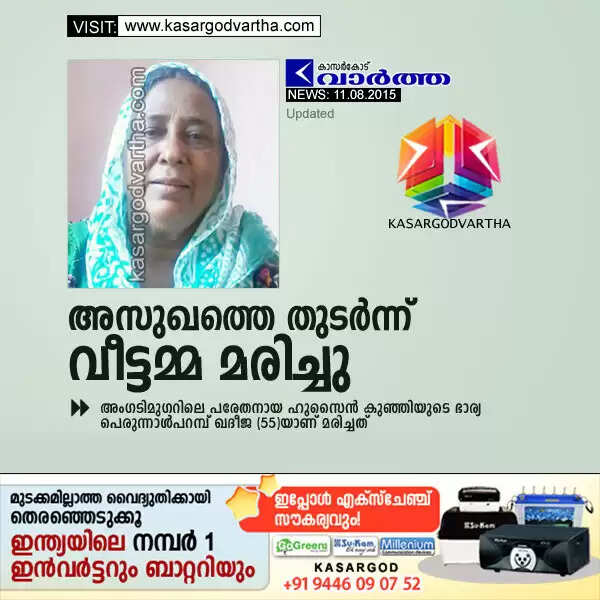 പുത്തിഗെ: (www.kasargodvartha.com 11/08/2015) കിഡ്നി സംബന്ധമായ അസുഖത്തെ തുടര്ന്ന് ചികിത്സയിലായിരുന്ന വീട്ടമ്മ മരിച്ചു. അംഗടിമുഗര് ബെന്ത്തടുക്കയിലെ പരേതനായ അന്തുഞ്ഞി - ബീഫാത്വിമ ദമ്പതികളുടെ മകള് പെരുന്നാള്പറമ്പ് ഖദീജ (55)യാണ് മരിച്ചത്. മംഗളൂരുവിലെ സ്വകാര്യ ആശുപത്രിയില് ചൊവ്വാഴ്ച ഉച്ചയ്ക്കായിരുന്നു അന്ത്യം.