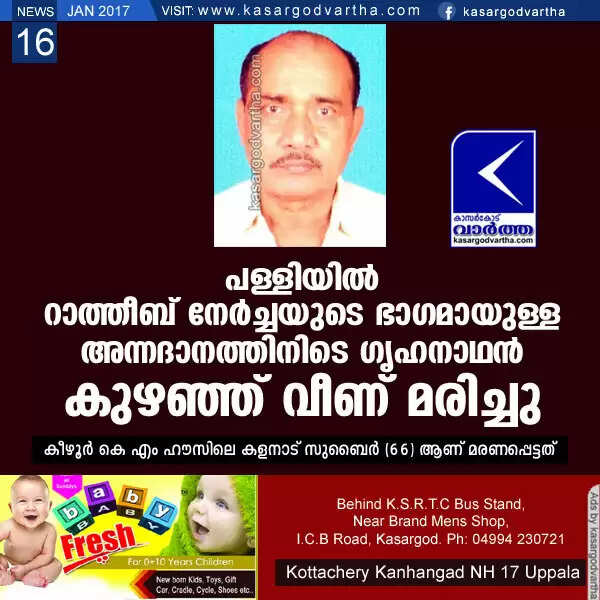 പള്ളിയില് റാത്തീബ് നേര്ച്ചയുടെ ഭാഗമായുള്ള അന്നദാനത്തിനിടെ ഗൃഹനാഥന് കുഴഞ്ഞ് വീണ് മരിച്ചു