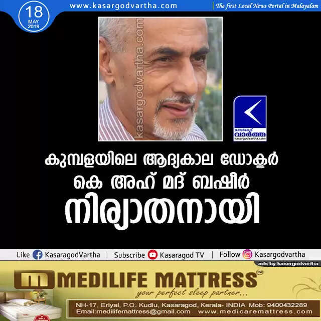 കുമ്പള: (www.kasargodvartha.com 18.05.2019) കുമ്പളയിലെ ആദ്യകാല ഡോക്ടര്‍ കെ അഹ് മദ് ബഷീര്‍ (71)നിര്യാതനായി. കുമ്പള- ബദിയടുക്ക റോഡില്‍ കെ എം എ ഹെല്‍ത്ത് സെന്റര്‍ നടത്തിവരികയായിരുന്നു. മുളിയാര്‍ മല്ലം സ്വദേശിയാണ്.