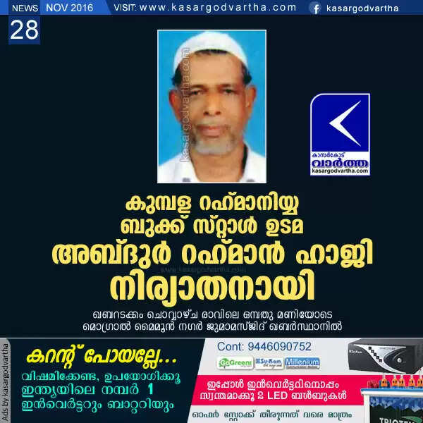 കുമ്പള റഹ് മാനിയ്യ ബുക്ക് സ്റ്റാള് ഉടമ അബ്ദുര് റഹ് മാന് ഹാജി നിര്യാതനായി