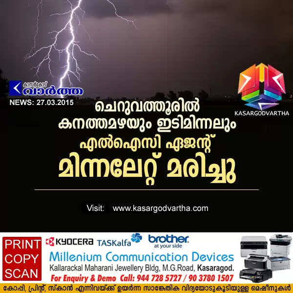 ചെറുവത്തൂര്‍: (www.kasargodvartha.com 27/03/2015) ചെറുവത്തൂരിലും പരിസരപ്രദേശങ്ങളിലും കനത്തമഴയും ഇടിമിന്നലും. മിന്നലേറ്റ് എല്‍.ഐ.സി. ഏജന്റ് മരിച്ചു. ചെറുവത്തൂര്‍ തിമിരിയിലെ കുഞ്ഞമ്പുവിന്റെ മകന്‍ കീരന്തോട് ബാലന്‍ (44) ആണ് മരിച്ചത്.