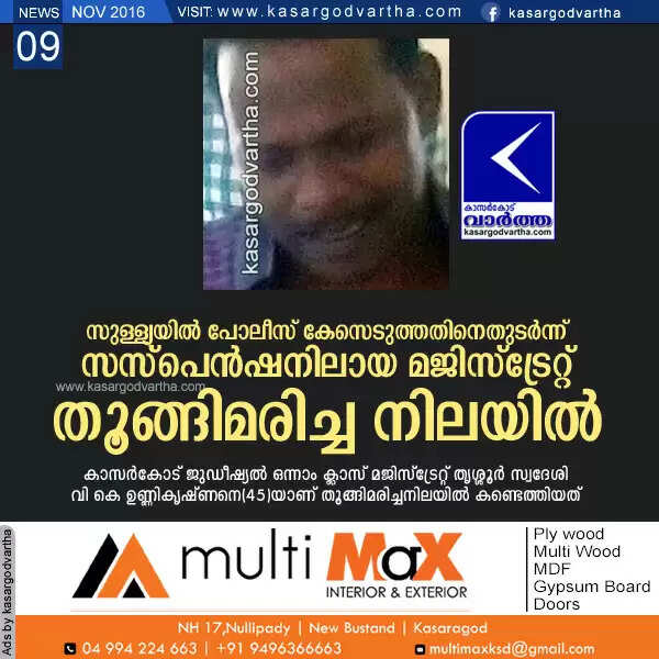 സുള്ള്യയില് പോലീസ് കേസെടുത്തതിനെതുടര്ന്ന് സസ്പെന്ഷനിലായ മജിസ്ട്രേറ്റ് തൂങ്ങിമരിച്ചനിലയില്