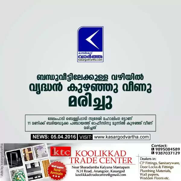 ബദിയടുക്ക: (www.kasargodvartha.com 05.04.2016) ബന്ധുവീട്ടിലേക്ക് പോകാന്‍ ബസിറങ്ങിയ ദേലംപാടി സ്വദേശി കുഴഞ്ഞു വീണ് മരിച്ചു. ദേലംപാടി ബെള്ളിപ്പാടി സ്വദേശി മഹാലിംഗ ഭട്ടാ(78)ണ് 11 മണിക്ക് ബദിയഡുക്ക പഞ്ചായത്ത് ഓഫീസിനു മുന്നില്‍ കുഴഞ്ഞ് വീണ് മരിച്ചത്.