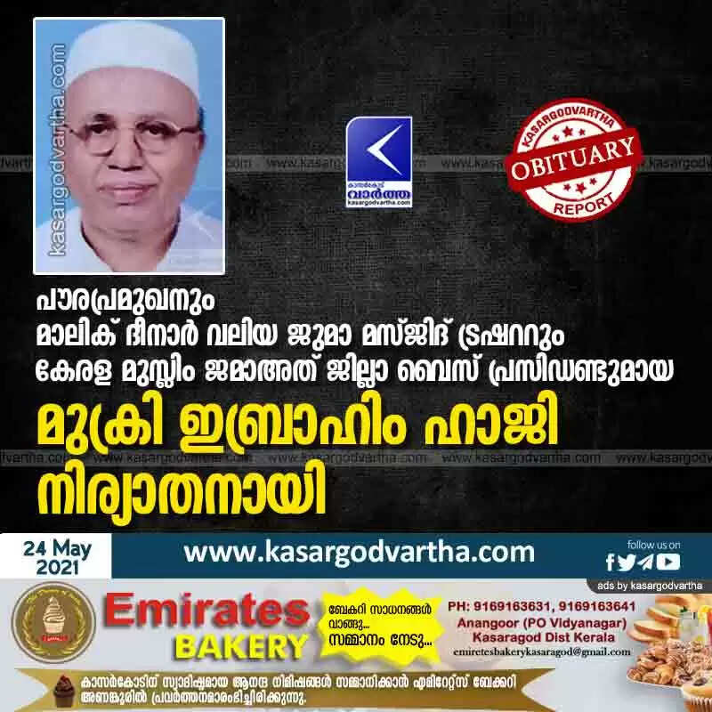 പൗരപ്രമുഖനും മാലിക് ദീനാർ വലിയ ജുമാ മസ്ജിദ് ട്രഷററും കേരള മുസ്ലിം ജമാഅത് ജില്ലാ വൈസ് പ്രസിഡണ്ടുമായ മുക്രി ഇബ്രാഹിം ഹാജി നിര്യാതനായി
