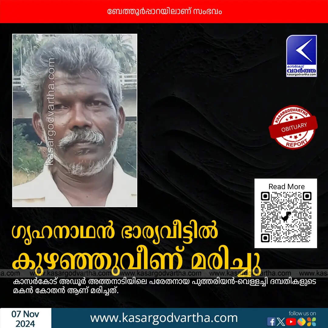 ബുധനാഴ്ച വൈകുന്നേരം കുളിമുറിയിൽ കുഴഞ്ഞുവീണ കോതനെ ഉടൻ ബേഡകം താലൂക് ആശുപത്രിയിൽ എത്തിച്ചുവെങ്കിലും മരണപ്പെടുകയായിരുന്നു. മൃതദേഹം പോസ്റ്റ് മോർടത്തിനായി കാസർകോട് ജെനറൽ ആശുപത്രി മോർചറിയിലേക്ക് മാറ്റി.