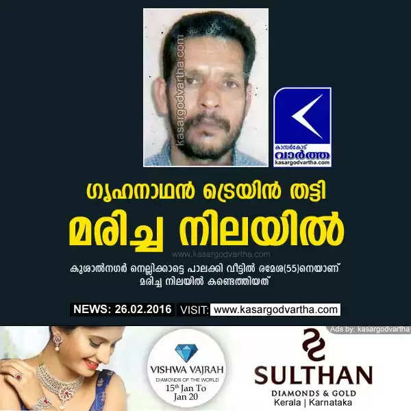 കാഞ്ഞങ്ങാട്: (www.kasargodvartha.com 26/02/2016) ഗൃഹനാഥനെ ട്രെയിന് തട്ടി മരിച്ച നിലയില് കണ്ടെത്തി. കുശാല്നഗര് നെല്ലിക്കാട്ടെ പാലക്കി വീട്ടില് രമേശ(55)നെയാണ് വ്യാഴാഴ്ച രാത്രി മരിച്ച നിലയില് കണ്ടെത്തിയത്. പയ്യന്നൂര് ചെറുതാഴം സ്വദേശിയാണ് രമേശന്. 22 വര്ഷം മുമ്പാണ് നെല്ലിക്കാട്ടെത്തിയത്.