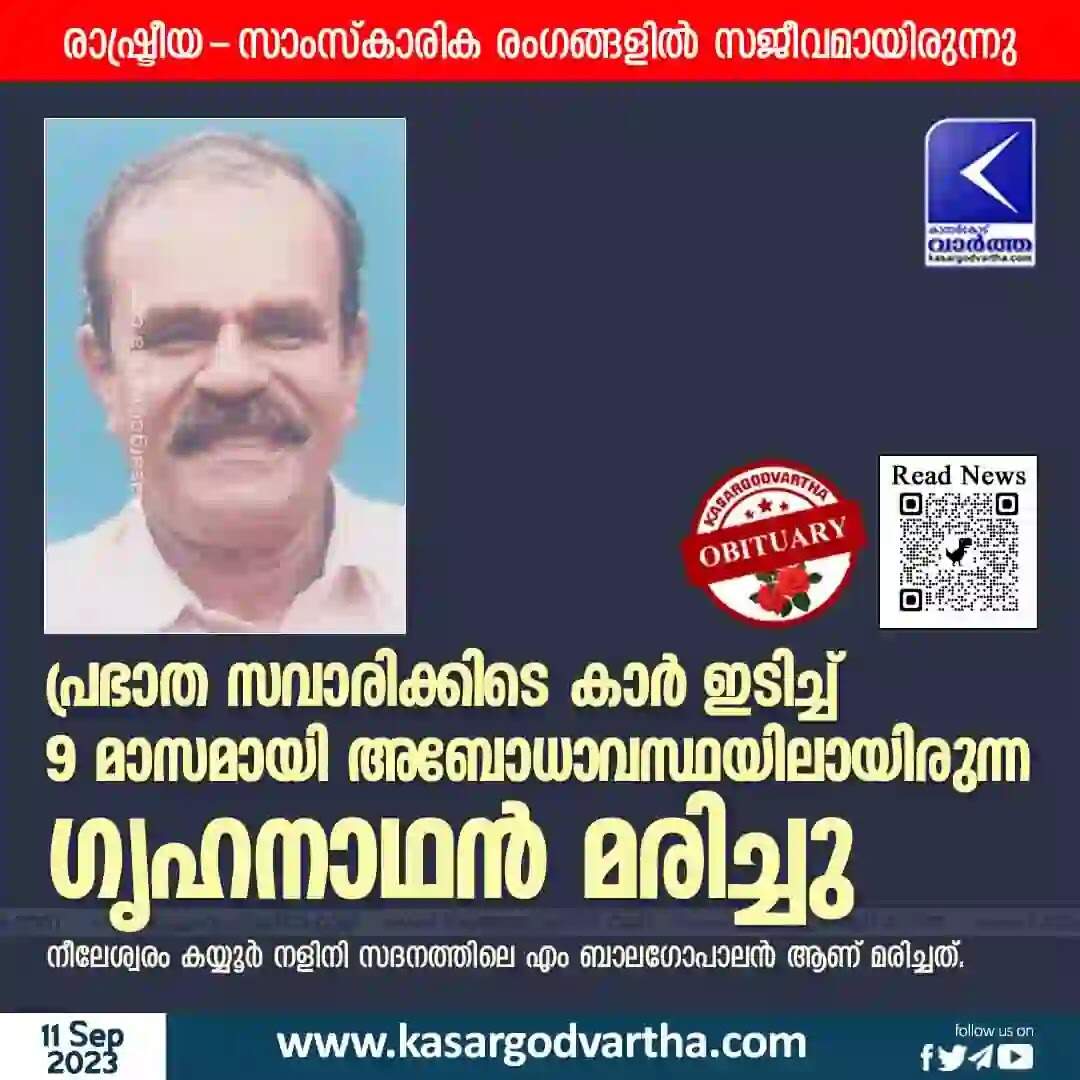 നീലേശ്വരം: (www.kasargodvartha.com) പ്രഭാത സവാരിക്കിടെ കാർ ഇടിച്ച് ഗുരുതരമായി പരുക്കേറ്റ് ഒമ്പത് മാസമായി അബോധാവസ്ഥയിൽ ചികിത്സയിലായിരുന്ന ഗൃഹനാഥൻ മരിച്ചു. കയ്യൂർ നളിനി സദനത്തിലെ എം ബാലഗോപാലൻ (62) ആണ് മരിച്ചത്. 2022 ഡിസംബർ അഞ്ചിന് പുലർചെ കയ്യൂർ അരയാക്കടവ് പാലത്തിന് മുകളിലാണ് അപകടമുണ്ടായത്.