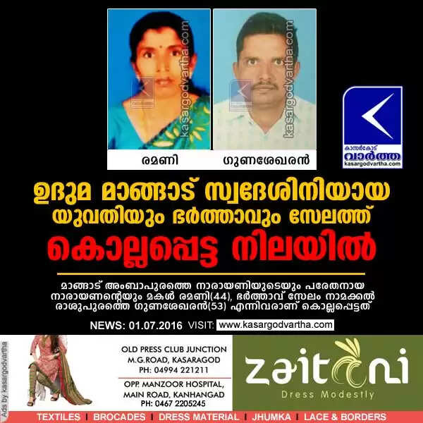 ഉദുമ മാങ്ങാട് സ്വദേശിനിയായ യുവതിയും ഭര്ത്താവും സേലത്ത് കൊല്ലപ്പെട്ട നിലയില്