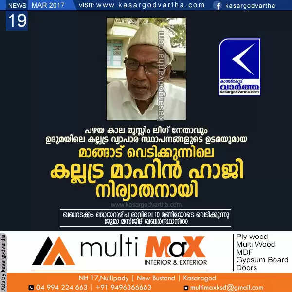 പഴയ കാല മുസ്ലിം ലീഗ് നേതാവും ഉദുമയിലെ കല്ലട്ര വ്യാപാര സ്ഥാപനങ്ങളുടെ ഉടമയുമായ മാങ്ങാട് വെടിക്കുന്നിലെ കല്ലട്ര മാഹിൻ ഹാജി നിര്യാതനായി